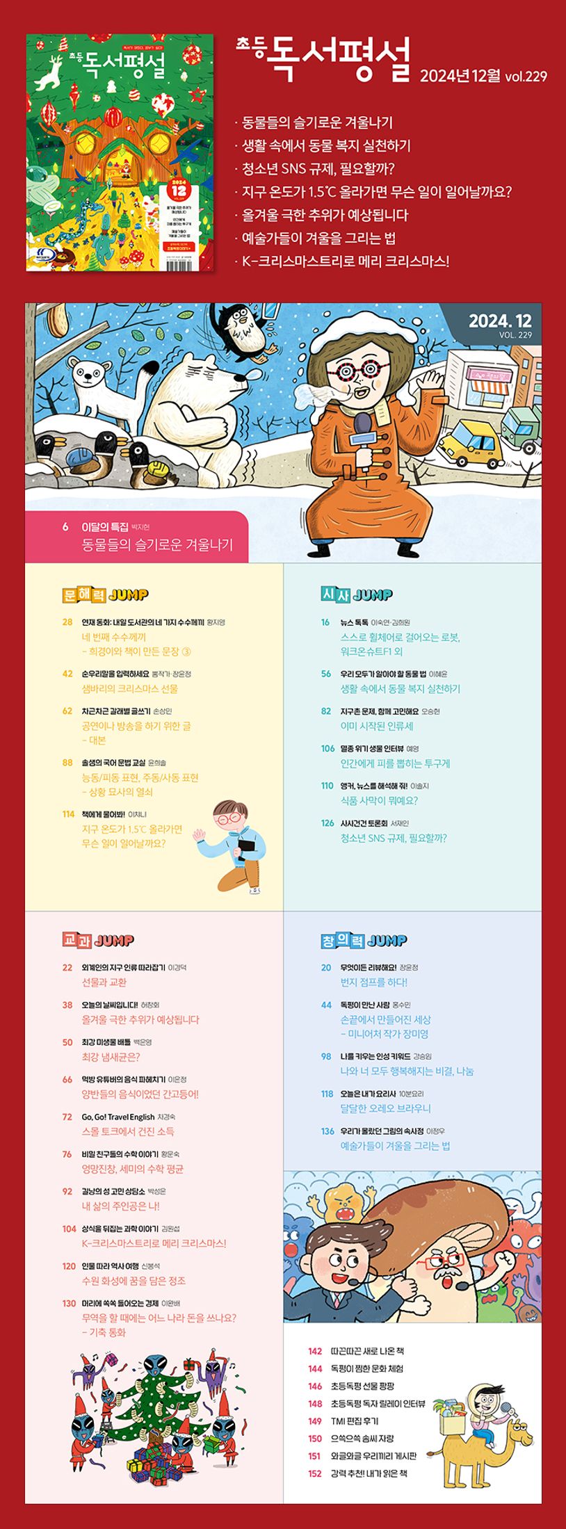 6 이달의특집 동물들의슬기로운겨울나기 박지현문해력JUMP28 연재동화:내일도서관의네가지수수께끼 황지영 네번째수수께끼-희경이와책이만든문장③42 순우리말을입력하세요 뿜작가․장윤정 샘바리의크리스마스선물은?62 차근차근갈래별글쓰기 손상민 공연이나방송을하기위한글-대본88 솔샘의국어문법교실 윤희솔 능동/피동표현,주동/사동표현-상황묘사의열쇠114 책에게물어봐! 이챠니 지구온도가1.5℃올라가면무슨일이일어날까요?시사JUMP16 뉴스톡톡 이숙연․김희원 스스로휠체어로걸어오는로봇,워크온슈트F1외56 우리모두가알아야할동물법 이혜윤 생활속에서동물복지실천하기82 지구촌문제,함께고민해요 오승현 이미시작된인류세106 멸종위기생물인터뷰 예영 인간에게피를뽑히는투구게110 앵커,뉴스를해석해줘! 이솔지 식품사막이뭐예요?126 사사건건토론회 서재인 청소년SNS규제,필요할까?교과JUMP22 외계인의지구인류따라잡기 이경덕 선물과교환38 오늘의날씨입니다! 허창회 올겨울극한추위가예상됩니다50 미생물이궁금해! 백은영 최강냄새균은?66 먹방유튜버의음식파헤치기 이은정 양반들의음식이었던간고등어!72 Go,Go!TravelEnglish 차경숙 스몰토크에서건진소득79 비밀친구들의수학이야기 황문숙 엉망진창,세미의수학평균92 길냥의성고민상담소 박성은 내삶의주인공은나!104 상식을뒤집는과학이야기 김원섭 K-크리스마스트리로메리크리스마스!120 인물따라역사여행 신봉석 수원화성에꿈을담은정조130 머리에쏙쏙들어오는경제 이완배 무역을할때에는어느나라돈을쓰나요?-기축통화창의력JUMP20 무엇이든리뷰해요! 장윤정 번지점프를하다!44 독평이만난사람 홍수민 손끝에서만들어진세상-미니어처작가장미영98 나를키우는인성키워드 강승임 나와너모두행복해지는비결,나눔118 오늘은내가요리사 10분요리 달달한오레오브라우니136 우리가몰랐던그림의속사정 이정우 예술가들이겨울을그리는법142 따끈따끈새로나온책144 독평이찜한문화체험146 초등독평선물팡팡148 초등독평독자릴레이인터뷰149 TMI편집후기150 으쓱으쓱솜씨자랑151 와글와글우리끼리게시판152 강력추천!내가읽은책