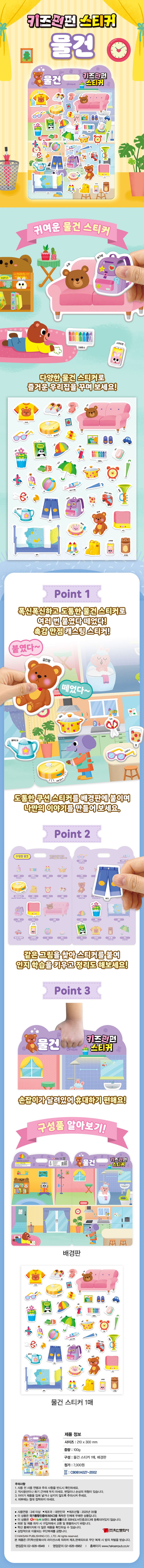 알록달록한물건을붙였다떼었다말랑말랑한쿠션스티커로만나보세요!하나,붙였다떼었다무한반복쿠션스티커!끈적임이적어붙였다떼었다반복해서놀수있습니다.둘,케이스200%활용하기!케이스를펼치면스티커를붙이고놀수있는배경판이나와요!원하는곳에스티커를이곳저곳붙이며나만의이야기를만들수있어더욱더재밌습니다.스티커놀이가끝나고케이스안쪽알맞은자리에스티커를붙여보관하면잃어버릴걱정도없겠죠?*인증유형:안전확인CB061A027-2002