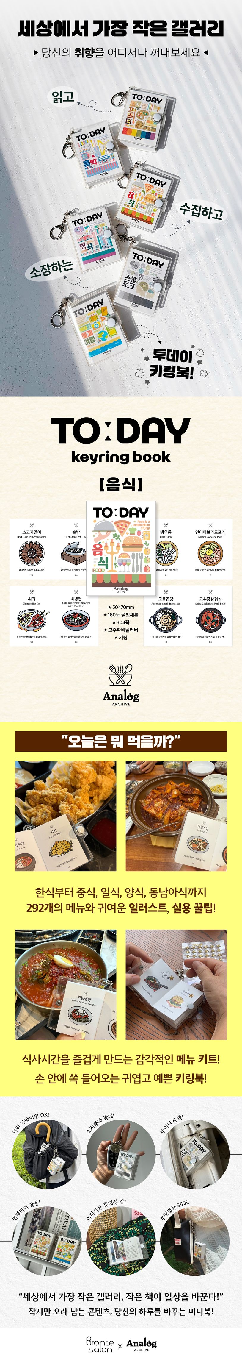 ‘내 하루 중심주의’ 철학을 바탕으로 새롭게 런칭한 아날로그아카이브의 ‘투데이 키링북’ 시리즈 음식 편. 손 안에 쏙 들어오는 귀여운 키링북으로 292개의 메뉴가 일러스트, 유쾌한 팁과 함께 실려 있다.