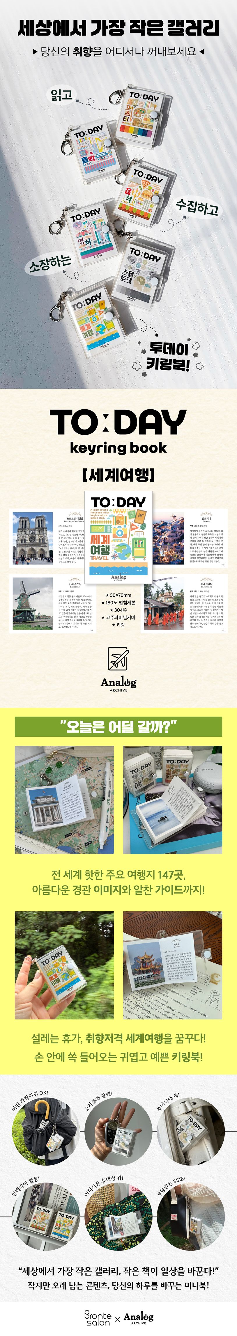 ‘내 하루 중심주의’ 철학을 바탕으로 새롭게 런칭한 아날로그아카이브의 ‘투데이 키링북’ 시리즈 세계여행 편. 손 안에 쏙 들어오는 귀여운 키링북으로 전 세계 주요 여행지 147곳의 경관 이미지와 가이드 정보가 알차게 실려 있다.
