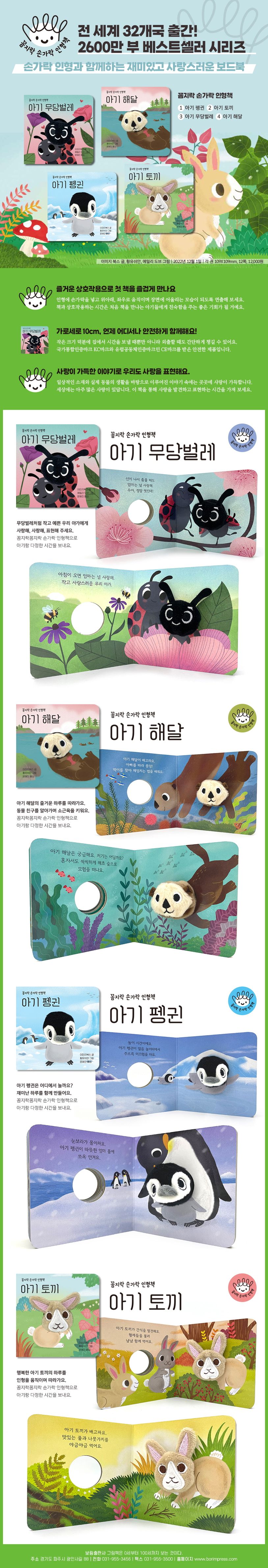 즐거운상호작용으로첫책을즐겁게만나요.〈꼼지락손가락인형책〉시리즈는동물인형을만지는경험으로이야기속에퐁당빠질수있어요.책의중앙에있는인형은가장마지막페이지에부착되어,표지부터마지막페이지까지모든장면에서등장합니다.인형에손가락을넣고위아래,좌우로움직이며장면에어울리는모습이되도록연출해보세요.동물들의몸짓은물론표정까지요리조리움직일수있습니다.이렇게만들어지는움직임으로책에재미를더하는특별한이야기를만들어보세요.책과상호작용하는시간은처음책을만나는아기들에게친숙함을주는좋은기회가될거예요.시각과촉각을동시에!소근육힘을키워요.따뜻한색감과사랑스럽고쉽고분명한일러스트로만들어진이책은아기들에게풍부한시각적자극으로다가올거예요.더불어아기가직접만지고놀수있는인형은손가락힘을키워소근육발달에도움이됩니다.아기의발달과정을함께할수있는귀엽고사랑스러운인형책입니다.가로세로10cm,언제어디서나안전하게함께해요!이시리즈는가로세로약10cm의작은크기로,집에서시간을보낼때뿐만아니라외출할때도간단하게챙길수있어요.또한펼치는쪽의모서리가둥글게제작되어베이거나찍힐위험이적고,국가통합인증마크KC마크와유럽공동체인증마크인CE마크를받은안전한제품입니다.언제어디서나안전하게즐길수있는〈꼼지락손가락인형책〉입니다.사랑이가득한이야기로우리도사랑을표현해요.일상적인소재와실제동물의생활을바탕으로이루어진이야기속에는곳곳에사랑이가득합니다.배가고픈아기펭귄은아빠와함께물고기를냠냠먹어요.잘시간이된아기해달은엄마랑나란히누워손을꼭잡고요.아기토끼는형제들과간식을나누어먹지요.이렇게세상에는아주많은사랑이있답니다.이책을통해사랑을발견하고표현하는시간을가져보세요.