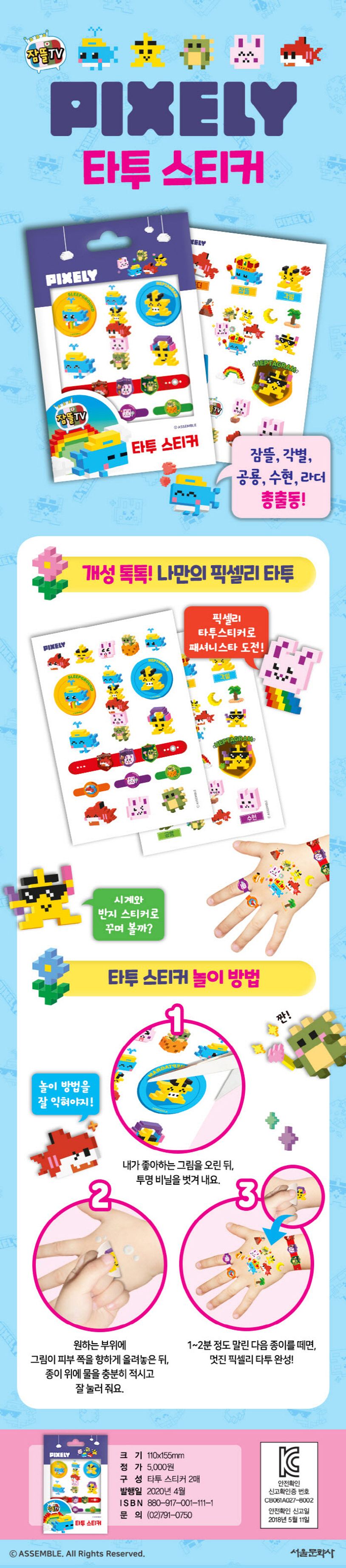 잠뜰과 각별, 공룡, 수현, 라더가 ‘픽셀리’ 캐릭터로 대변신했어요! 고래와 공룡, 토끼 등 새로운 모습으로 변신한 친구들을 〈픽셀리 타투 스티커〉로 만나 보세요. 잠뜰과 친구들의 귀엽고 재미난 모습은 물론, 시계와 반지 등 다양한 액세서리 타투 스티커도 가득해요. 픽셀리 타투 스티커만 있으면, 여러분도 멋진 패셔니스타가 될 수 있답니다! 꼬물꼬물 손가락과 발가락을 움직이며 타투 스티커를 붙이다 보면 소근육 운동도 되고, 캐릭터 이름을 보며 자연스럽게 한글도 익힐 수 있어요. 또한 KC 인증을 받은 국내 제작 타투 스티커로 안심하고 놀이할 수 있답니다.