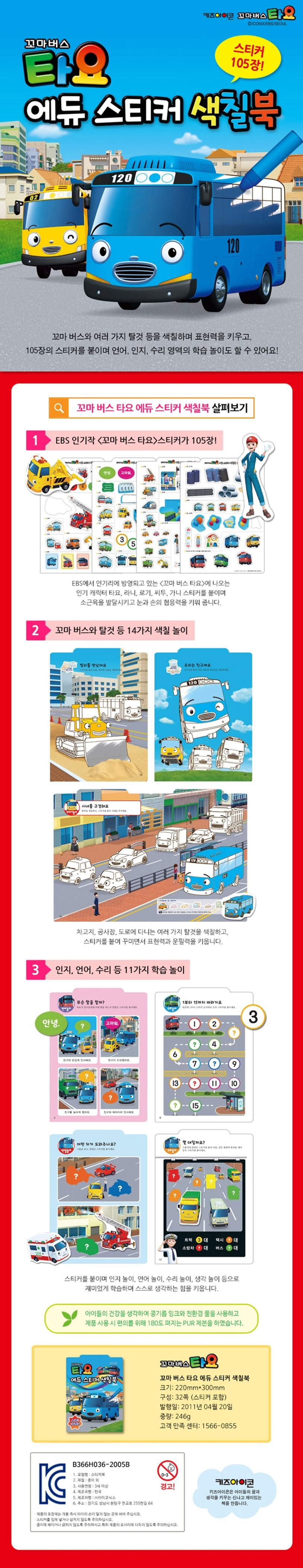 『꼬마버스 타요 에듀 스티커 색칠북』은 붙이고 색칠하며 표현하는 힘을 키우는 스티커 색칠북으로, 105장의 스티커가 수록되어 있다. 스티커를 붙이며 언어, 인지, 수리 등의 다양한 학습 개념을 익힐 수 있으며, 색칠 놀이를 통해 다양한 색깔을 익히고 표현력과 운필력을 기를 수 있다.