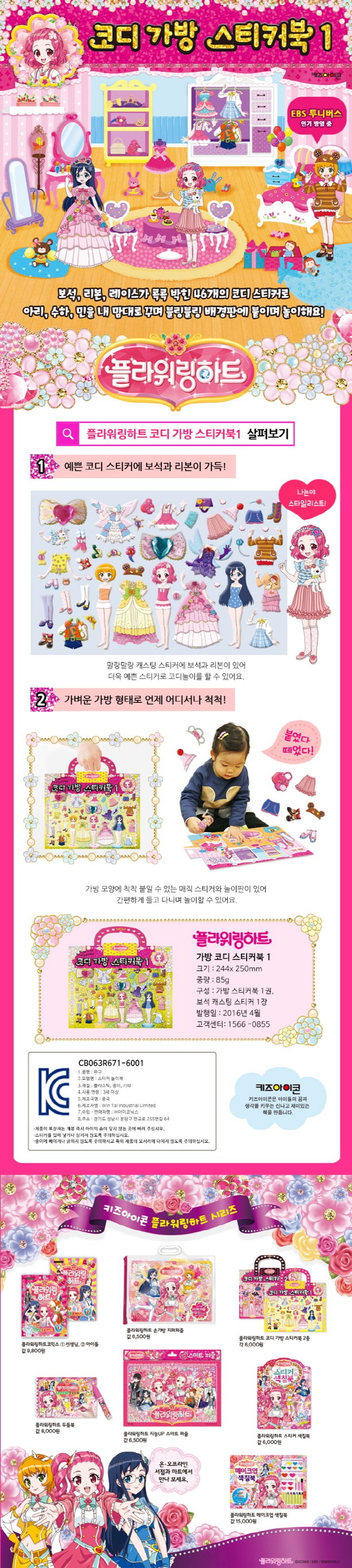[플라워링하트 코디 가방 스티커북]은 아이들이 좋아하는 플라워링하트 캐릭터로 즐겁게 스티커 놀이를 즐길 수 있습니다. 보석, 리본, 레이스가 콕콕 박힌 46개의 코디 스티커로 아리, 수하, 민을 내 맘대로 꾸며보세요! 가방 형태로 구성해 아이들이 쉽게 들고 다닐 수 있도록 만들었습니다.
