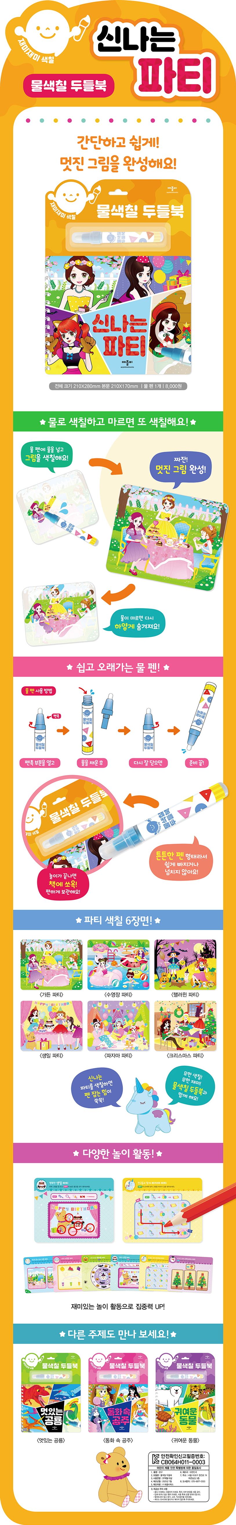 아이가 좋아하는 재미있는 파티 장면을 물 펜으로 칠해 손쉽게 완성하고, 재미있게 놀이해요.