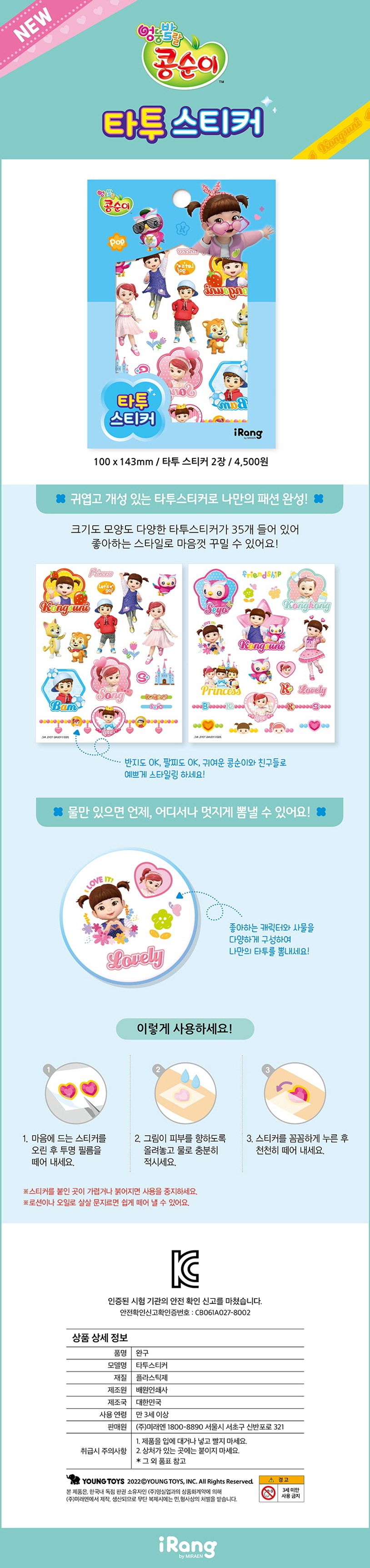 콩순이와 친구들 캐릭터를 타투 스티커로 만나요. 컬러 타투, 레터링 타투 등 다양한 종류의 타투 스티커 35개가 들어 있어 원하는 대로 오려 붙여 구성할 수 있어요. 기분에 따라 분위기에 따라 콩순이 타투 스티커로 스타일을 완성해 보세요.