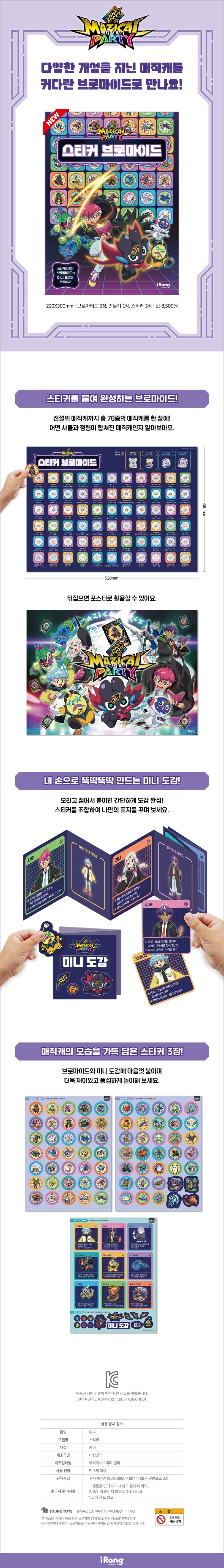 전설의 매직캐를 포함하여 총 70종의 매직캐를 380×520㎜ 크기의 거대한 브로마이드 한 장에 모두 담았어요. 빈 곳에 알맞은 매직캐 스티커를 찾아 붙이고 어떤 사물과 정령이 합쳐진 매직캐인지 알아보세요. 브로마이드를 뒤집으면 매지컬 파티의 주인공들이 그려진 멋진 포스터로도 활용할 수 있어요.