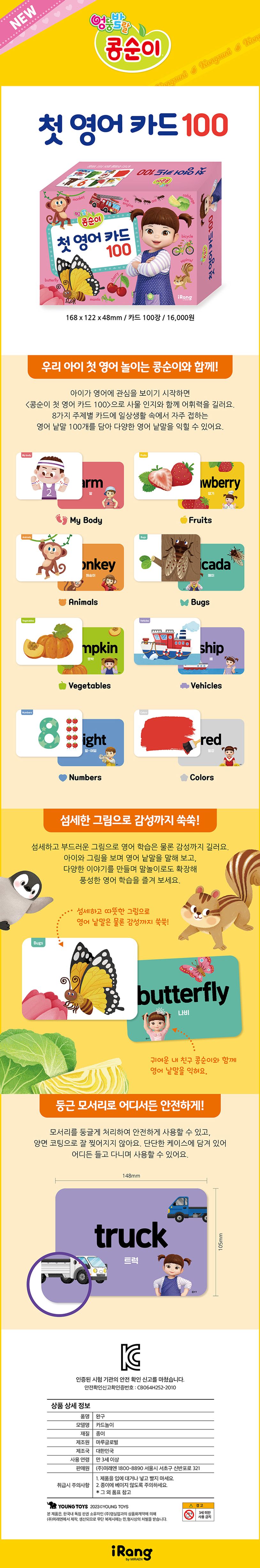 〈콩순이 첫 영어 카드 100〉은 나의 몸, 과일, 채소, 곤충, 교통수단, 동물, 숫자, 색 등 총 8가지 주제의 영어 낱말 100개를 담았어요. 아이가 생활 속에서 자주 접하는 낱말들을 영어로 익히며 어휘력을 키워 보세요.