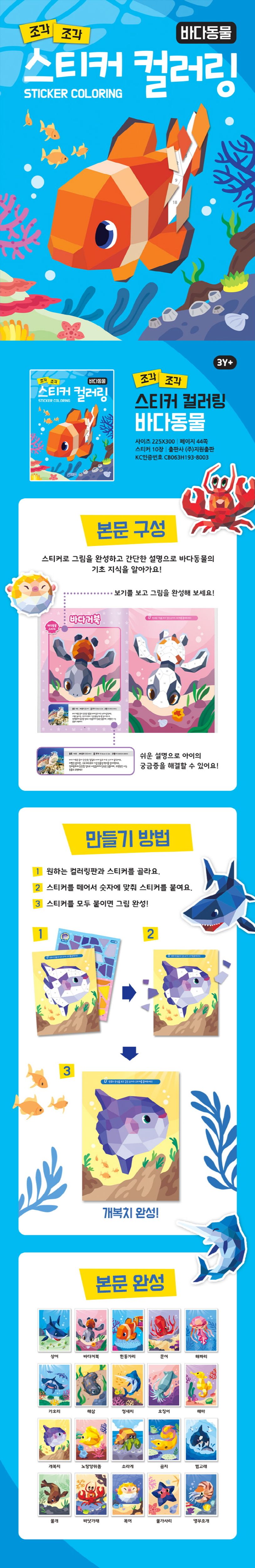 비어있는 곳에 스티커를 채워 그림을 완성하고, 간단한 설명으로 바다동물의
