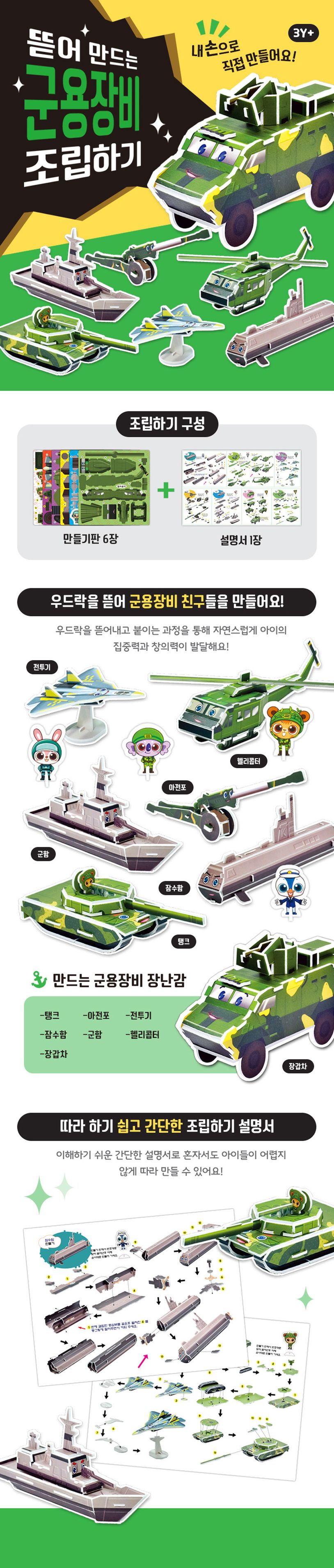 만들기판 6장에 있는 군용장비 모양을 뜯어서 조립하는 군용장비 만들기 놀이입니다.