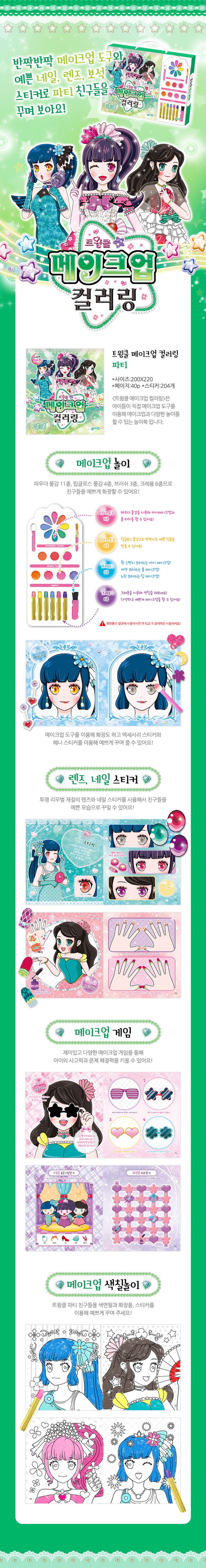 아이들이 직접 메이크업 도구를 이용해 메이크업과 다양한 놀이를 할 수 있는 메이크업 색칠 놀이북입니다. 파우더, 립글로스물감, 브러쉬, 크레용과 투명,종이 리무벌 스티커로 예쁘게 꾸미기를 할 수 있습니다.