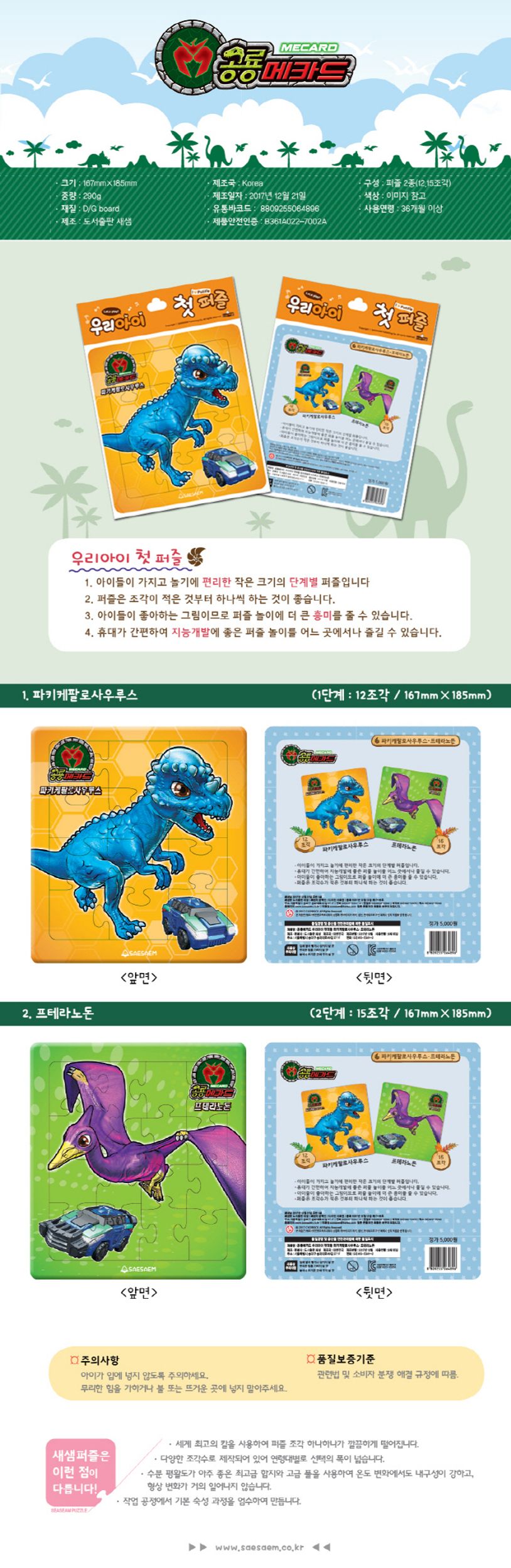 우리아이첫퍼즐공룡메카드3파키케팔로사우루스12조각프테라노돈15조각