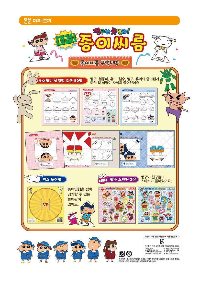 《짱구는 못말려! 대결! 종이씨름》으로 종이접기 실력을 키우고 가족과 친구들과 함께 놀이하며 즐거운 시간을 만들어 보세요!