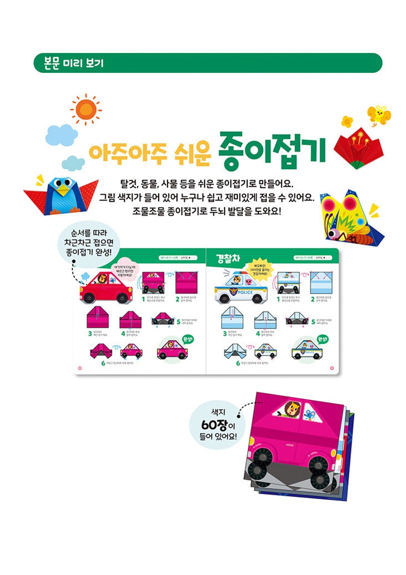 알록달록 예쁜 색종이를 접고 붙여서 나만의 작품을 만들어 꾸며보세요. 완성한 종이접기로 재미있게 꾸미며 놀 수 있답니다. 아주아주 쉬운 종이접기를 통해 집중력과 창의력은 물론, 성취감과 자신감도 길러보세요!