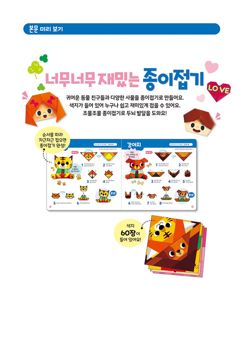 너무너무 재밌는 종이접기는 아이들이 좋아하는 동물 친구들과 사물들을 쉽고 재미있게 접을 수 있도록 만들었어요. 설명 순서에 따라 색종이를 접고 붙여서 놀이할 수 있답니다.