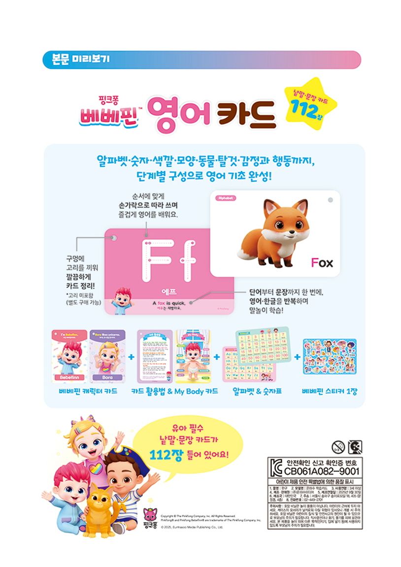 알파벳과 숫자는 물론, 색깔·모양·동물·탈것·감정과 행동까지! 단계별 학습으로 영어를 배우는 《핑크퐁 베베핀 영어 카드 112》가 출시되었습니다. 단순한 학습 도구를 넘어, 아이들이 즐겁게 놀이하며 영어 기초를 완성할 수 있는 맞춤형 교육 콘텐츠입니다.