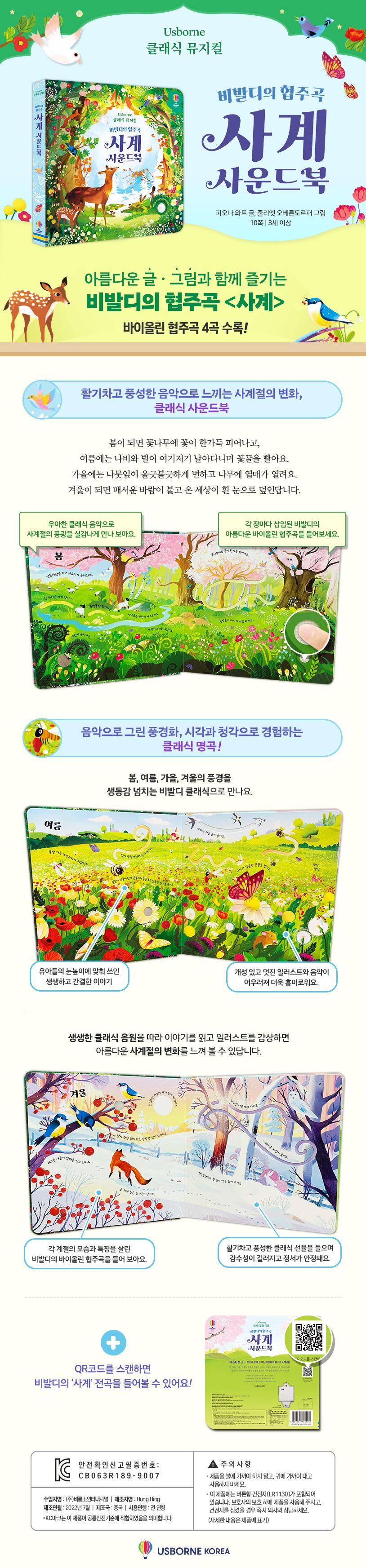 봄, 여름, 가을, 겨울의 풍경을 생동감 넘치는 비발디 클래식으로 만나 보세요. 생생한 클래식 음원을 따라 이야기를 읽고 일러스트를 감상하면 아름다운 사계절의 변화를 느껴 볼 수 있답니다. 새싹이 돋아나는 봄, 해가 뜨겁게 내리쬐는 여름, 나뭇잎이 알록달록하게 물드는 가을, 하얀 눈이 내리는 겨울 풍경을 활기찬 바이올린 선율과 함께 감상해 보세요.