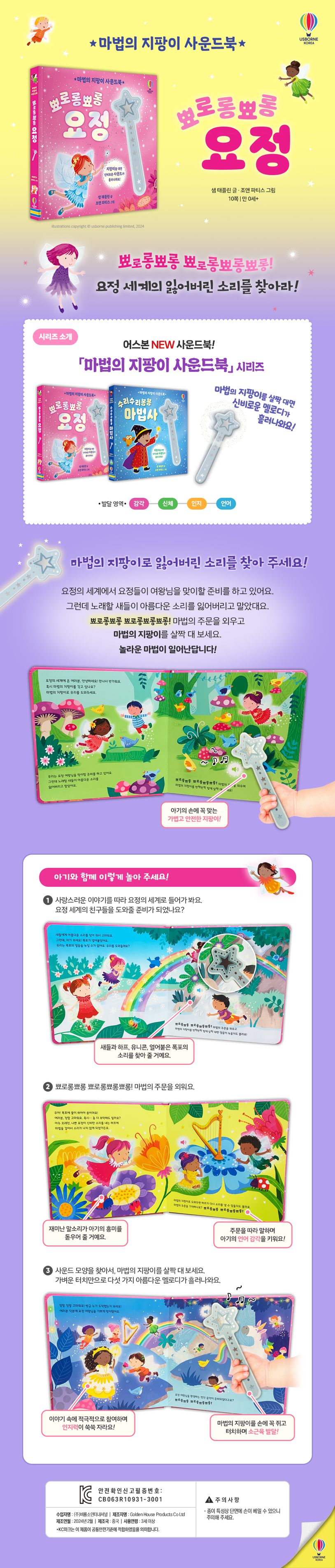책에 포함된 귀여운 막대 지팡이를 그림에 갖다 대면 신비로운 사운드가 흘러나오는 신기한 「마법의 지팡이 사운드북」 시리즈를 소개합니다. 요정 세계에서 펼쳐지는 재미난 이야기를 따라가며, 뽀로롱뾰롱 뾰로롱뾰롱뾰롱! 주문을 외우고, 마법의 지팡이로 책을 살짝 터치하면 다섯 가지 입체적인 멜로디가 흘러나와요. 아이들의 흥미를 돋우어 책 놀이에 즐겁게 참여하도록 이끌어 준답니다.