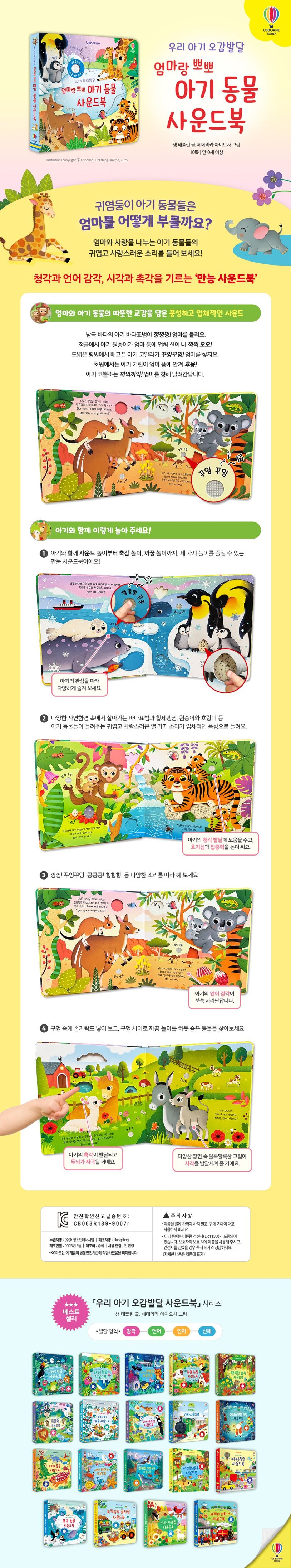 ○ 바다표범과 황제펭귄, 원숭이와 호랑이, 캥거루와 코알라, 기린과 코뿔소 등 다양한 자연환경 속에서 살아가는 아기 동물들의 귀엽고 사랑스러운 열 가지 소리가 입체적인 음향으로 들려요. 아기의 청각 발달에 도움을 주고, 호기심과 집중력을 높여 줘요.
