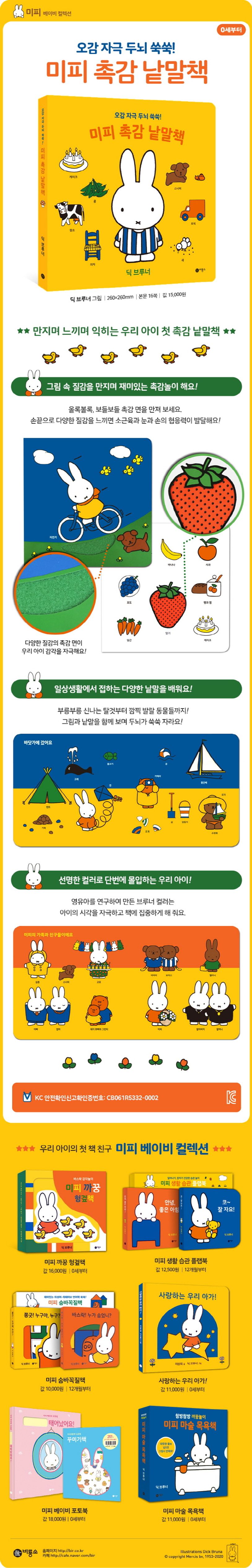 65년 동안 전 세계 아이들의 사랑을 받은 토끼, 미피가 아기들을 위한 「미피 베이비 컬렉션」 시리즈로 새롭게 선보입니다. 명료하고 사랑스러운 이미지로 캐릭터 디자인의 정점에 섰다는 평가를 받는 미피는 단순한 그림, 정면을 바라보는 시선, 선명하고 흡입력 있는 색채로 아기의 오감을 자극하고, 왕성한 두뇌 발달을 도와줍니다. 헝겊책, 목욕책, 보드북 등 다양한 놀이를 할 수 있는 「미피 베이비 컬렉션」을 통해 우리 아기 잠재력을 키워 주세요.