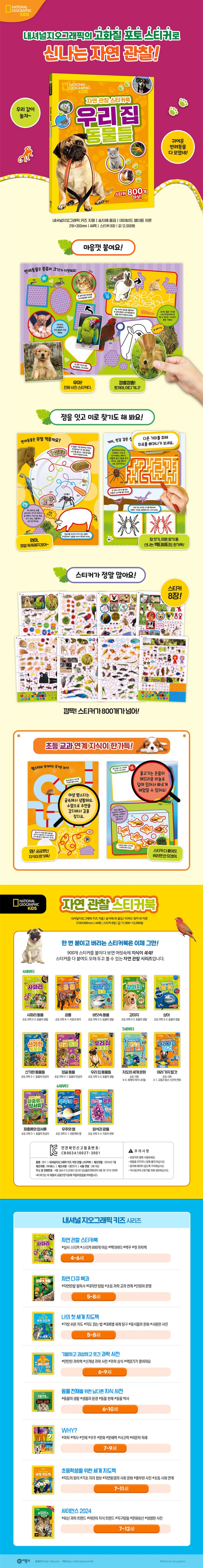 ■동물,탈것부터우주와세계문화까지두고두고꺼내보며똑똑해지는스티커북!내셔널지오그래픽에서만든포토스티커북「자연관찰스티커북」시리즈의최신간『우리집동물들』이㈜비룡소에서출간되었어요.이시리즈에는바닷속동물,정글동물등흥미진진한동물주제와아이들의사랑을듬뿍받는여러가지탈것,그리고우주,세계지도처럼똑똑한지식이쌓이는주제를더했답니다.페이지를넘기며장난꾸러기비글,뻐끔뻐끔금붕어,깜찍한햄스터까지별별반려동물포토스티커를붙여보세요.또,좋아하는먹이나특별한행동등궁금했던반려동물의정보를큼직한사진과쉽고짤막한설명으로접해보세요.어느새자연관찰지식도쏙쏙채워져요.이시리즈는스티커를다붙여도버릴수가없는,초등까지두고두고꺼내보는알찬자연관찰스티커북이랍니다.■‘내셔널지오그래픽’의고퀄리티포토스티커로붙이고,꾸미고!미로찾고,숫자세며,심심할틈없는액티비티북!이시리즈는1888년부터130여년동안전지구를탐험하고연구해온내셔널지오그래픽의수준높은사진들로스티커를꾸몄어요.무려900개이상넉넉하게담겨있어서신나게스티커놀이를할수있지요.다큐멘터리처럼생생한포토스티커가아이들의호기심을한껏자극한답니다.또,페이지마다미로찾기,선긋기,셈하기,규칙찾기,따라그리기등아이들의눈길을사로잡는액티비티가가득해요.잠시도지루할틈이없는신개념액티비티스티커북이랍니다.■느림보거북,잠꾸러기고양이,꿀꿀미니돼지등반려동물들과같이신나게놀아요!『우리집동물들』에는우리와함께살아가는반려동물들이반갑게인사를건네요.1000개가넘는명령을알아듣는보더콜리가있다는거아세요?새끼고양이가하루에20시간이나잔다는사실은요?반려동물들이기분좋을때어떤특별한소리를내고행동을하는지등유익한지식도가득담겨있지요.강아지,고양이,토끼같은친근한반려동물부터꿈틀꿈틀도마뱀,털북숭이타란툴라등이색반려동물까지생생한스티커를붙이며우리의친구반려동물에대해알아보세요!■초등교과연계!과학,사회교과서도미리미리예습!이시리즈는모두초등과학,사회교과서와연계되어있어요.『바닷속동물』,『정글동물』,『파충류와양서류』에서는초등3학년과학교과의‘동물의생활’,‘동물의한살이’를미리익힐수있어요.『암석과광물』에서는초등학교3학년과학‘지표의변화’에나온기초지식을다질수있지요.『여러가지탈것』에서는초등4학년사회의‘교통과통신수단의변화’를,『지도와세계문화』에서는초등6학년사회의‘세계여러나라들’을엿볼수있어요.이시리즈는초등입학전아이들에게학습자신감을심어주는멋진자연관찰스티커북이랍니다.