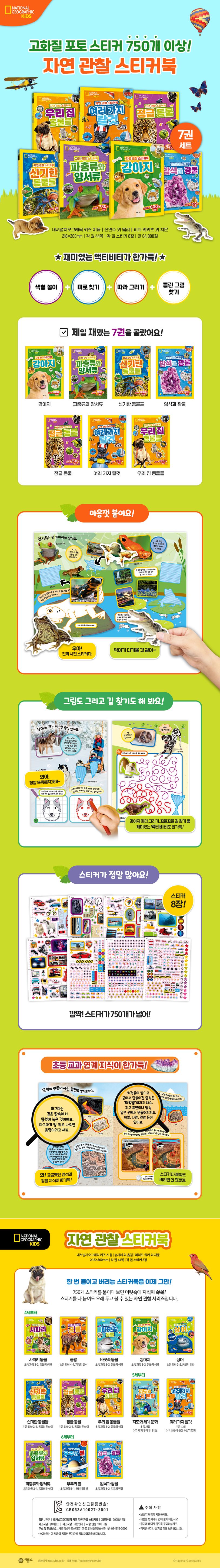 전 세계 28개국 어린이들이 함께 보는 내셔널지오그래픽에서 만든 포토 스티커북 「내셔널지오그래픽 키즈 자연 관찰 스티커북」 시리즈 중 제일 재밌는 7권을 모았어요. 이번 세트에는 ‘강아지’, ‘암석과 광물’, ‘파충류와 양서류’, ‘신기한 동물들’, ‘정글 동물’, ‘우리 집 동물들’, ‘여러 가지 탈것’까지 아이들의 호기심을 자극하는 주제들을 골라 담았답니다.