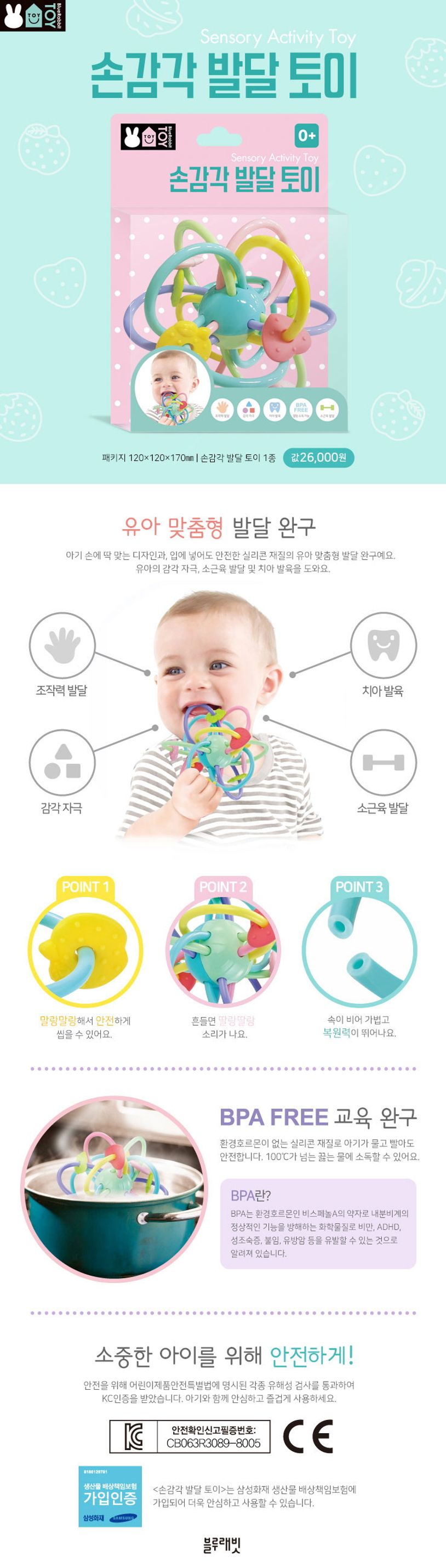 아기가 물건을 잡을 수 있게 되면, 어떤 물건이든 손으로 만지고 입에 넣어 보면서 탐색 활동을 시작해요. 〈손감각 발달 토이〉는 아기의 손과 입으로 감각을 자극하면서 두뇌 계발을 돕는 유아 맞춤형 발달 완구랍니다. 가볍고 복원력이 좋아 오래 사용할 수 있고, 아기 손으로도 잡기 쉬운 끈 디자인에 말랑해서 안전하게 씹을 수 있는 치발기가 달려있어요. 잡고 흔들면 딸랑딸랑 소리도 나서 아기의 흥미를 자극하며 감각 자극, 소근육 발달 및 치아 발육을 도와요.