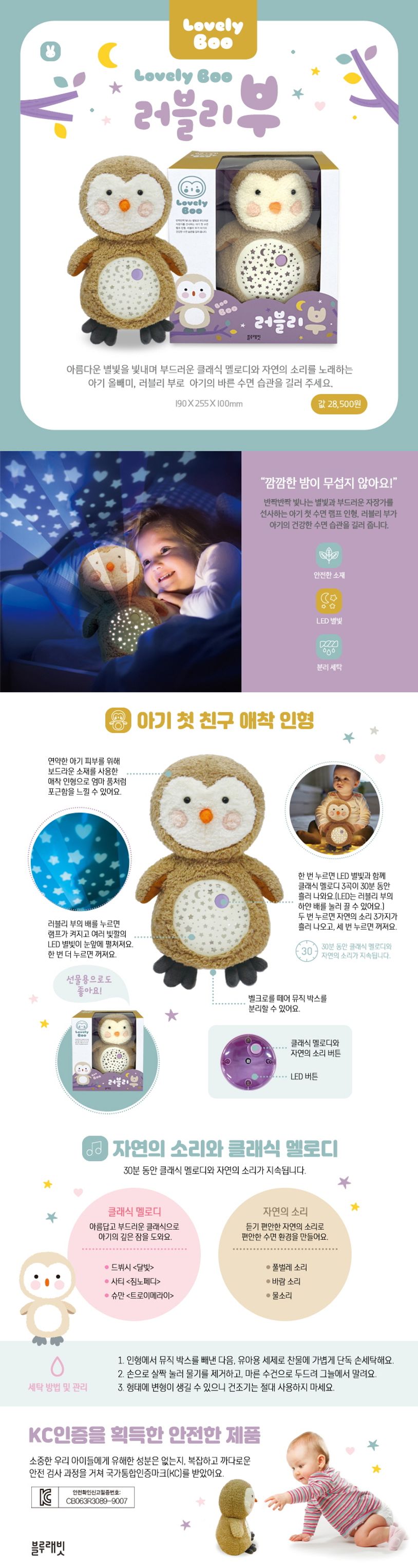 아기의 편안한 잠을 위해 깜깜한 방 안에 러블리 부를 켜 보세요. 어두운 방 안을 수놓는 파랑, 보라, 핑크, 초록 등 다양한 색깔의 별빛이 아기의 시선을 사로잡을 거예요. 많은 아이들은 불이 꺼지면 엄마, 아빠의 얼굴이 보이지 않아 두려움을 느낀답니다. 그때 방 안에 러블리 부의 별빛 램프가 펼쳐진다면 아이들의 두려움은 신기함으로 바뀌고 마음의 안정을 찾게 될 거예요. 또, 아기를 위한 클래식 멜로디와 풀벌레 소리, 바람 소리, 물소리 등 자연의 소리가 흘러나와 아기를 편안한 잠으로 이끌지요.