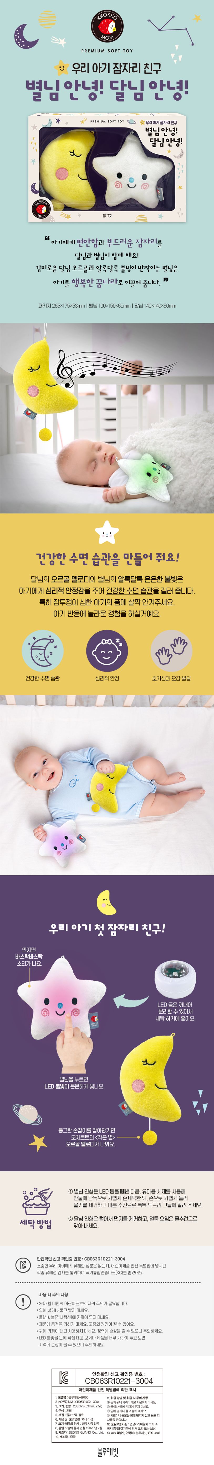 건강한 수면은 아기의 신체 발달과 정서 발달에 많은 영향을 준다. 잠을 잘 자야 키가 자라고 두뇌가 발달하며 면역력이 높아지기 때문이다. 아기가 칭얼대고 잠투정을 할 때 별님과 달님을 아기의 품에 안겨 주자. 알록달록 은은한 불빛의 별님과 맑고 고운 오르골 멜로디가 나는 달님이 아기가 편안하게 잠들도록 도와준다.