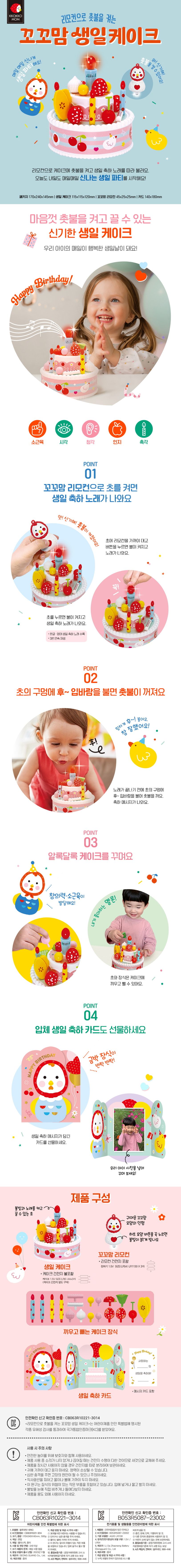 〈리모컨으로 촛불을 켜는 꼬꼬맘 생일 케이크〉는 아이의 안전을 최우선으로 생각하여 만들었습니다. 어린이제품 안전 특별법에 명시된 각종 유해성 검사를 통과하여 KC인증을 받았습니다. 안전성이 검증된 제품으로 아이와 함께 즐겁게 사용하세요.
