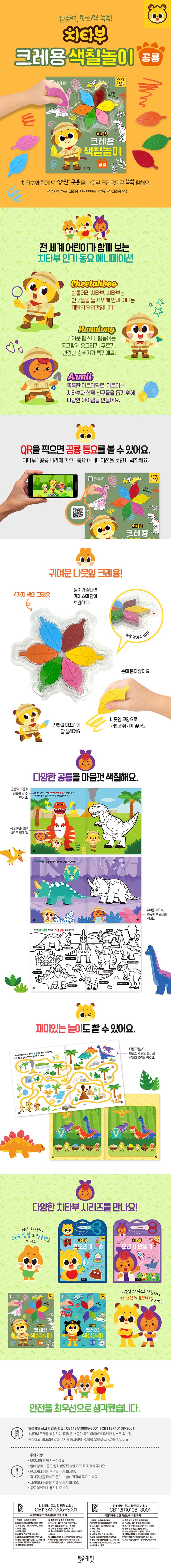 인기 있는 치타부 동요 애니메이션에 나오는 다양한 공룡을 알록달록 나뭇잎 크레용으로 색칠해 보자. 아주 오래 전 지구에서 살았던 티라노사우루스, 트리케라톱스, 브라키오사우루스, 스테고사우루스, 파라사우롤로푸스, 안킬로사우루스, 스피노사우루스, 프테라노돈, 파키케팔로사우루스 등의 이름을 익히고, 하나하나 색칠하면서 상상력을 키운다.