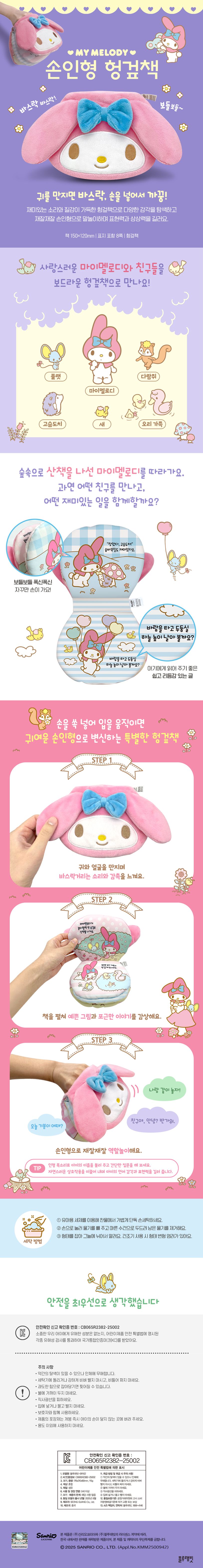 머리 위로 손을 쏙 집어넣으면 재잘재잘 손인형으로 변신! 손을 벌렸다 닫았다 하면 마이멜로디 손인형이 말하듯 입을 움직입니다.
