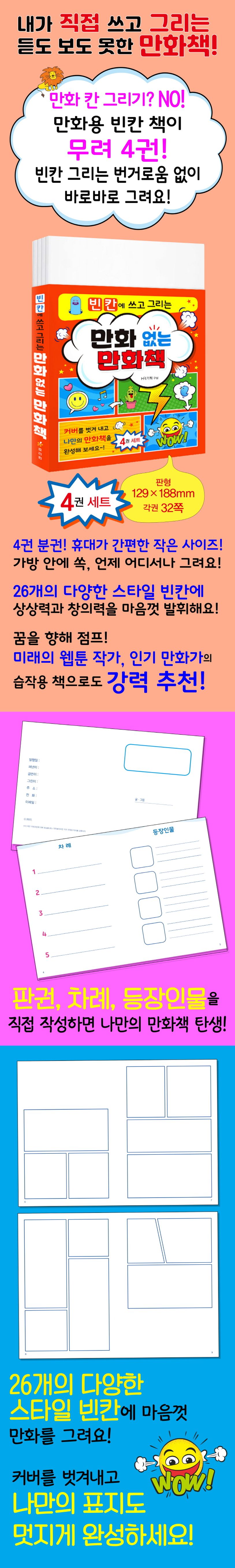 4권 세트 모두 만화를 그릴 수 있는 빈칸으로 구성되어 만화 칸을 그리는 번거로움 없이 바로 만화를 그릴 수 있습니다.