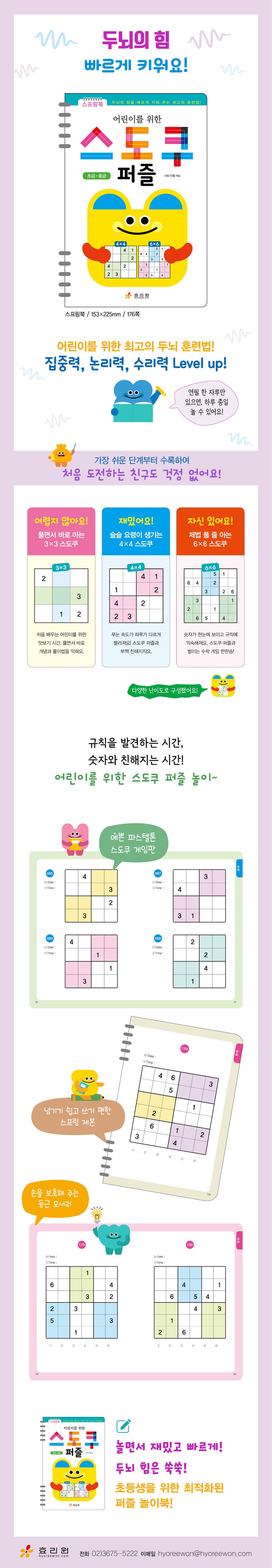 흔히 놀이법을 말로 설명하면 무척 어렵게 느껴져요. 한두 번만 직접 해 보면 쉽게 이해할 수 있는데 말이지요. 그래서 《어린이를 위한 스도쿠 퍼즐(초급·중급 편)》은 가장 쉬운 단계 [3×3 스도쿠]부터 수록했어요. 유아들도 풀 수 있는 단계라서, 처음 배우는 어린이가 ‘풀면서 바로’ 규칙과 놀이법을 이해하게끔 구성한 것이지요. 풀이법을 이해하면 [4×4 스도쿠]로 넘어가 ‘빠르게 푸는 요령’을 익히게 됩니다. 푸는 속도가 붙으면 [6×6 스도쿠]를 풀면서 ‘제법 풀 줄 아는’ 실력을 쌓을 수 있게 되지요. 푸는 재미에 쌓이는 실력까지,《어린이를 위한 스도쿠 퍼즐(초급·중급 편)》은 재미와 성취감을 만족시키는, 초등 어린이를 위해 최적화된 퍼즐 놀이북입니다.