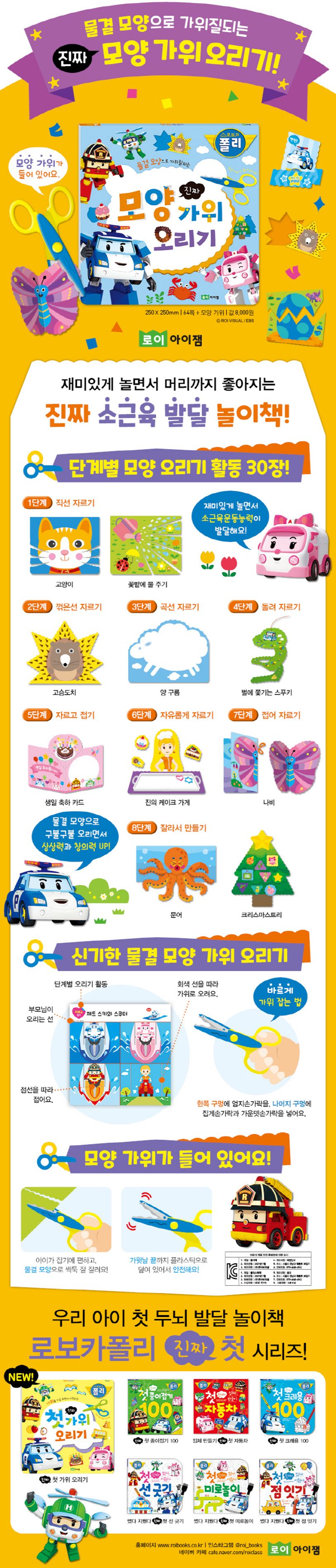 〈로보카폴리 진짜 모양 가위 오리기〉는 오리기에 흥미를 느끼기 시작한 아이들에게 딱 맞춘 책이에요! 직선 자르기부터 시작해서, 꺾은선, 어려운 곡선은 물론 복잡한 선 자르기까지 점차 정교해지는 가위질 놀이가 단계별로 구성되어 있어요.