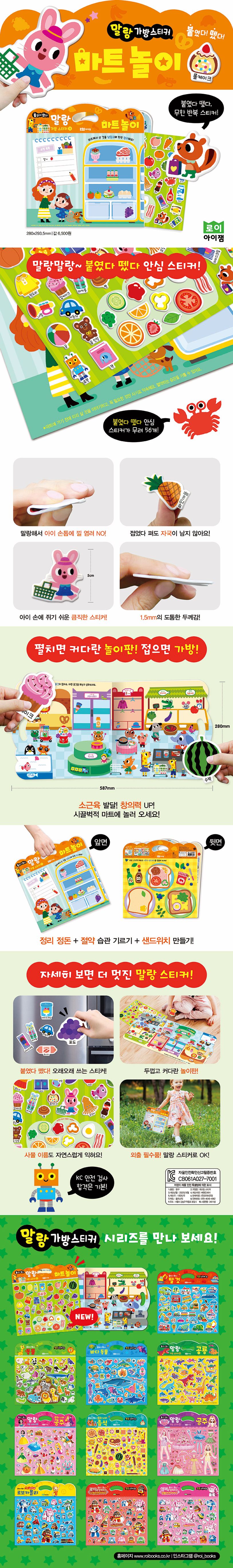 ‘마트 놀이’ 편에서는 마트에서 판매하는 여러 가지 물건을 스티커로 만날 수 있어요. 아이들에게 친숙한 인형, 책, 장난감뿐만 아니라 과일, 채소, 생선, 빵 등 여러 가지 스티커가 알차게 구성되어 있답니다. 스티커를 여러 번 붙였다 떼며 소근육운동능력이 자연스럽게 발달되고, 사물의 이름과 한글도 자연스럽게 익힐 수 있는 마트 놀이 스티커를 만나 보세요!