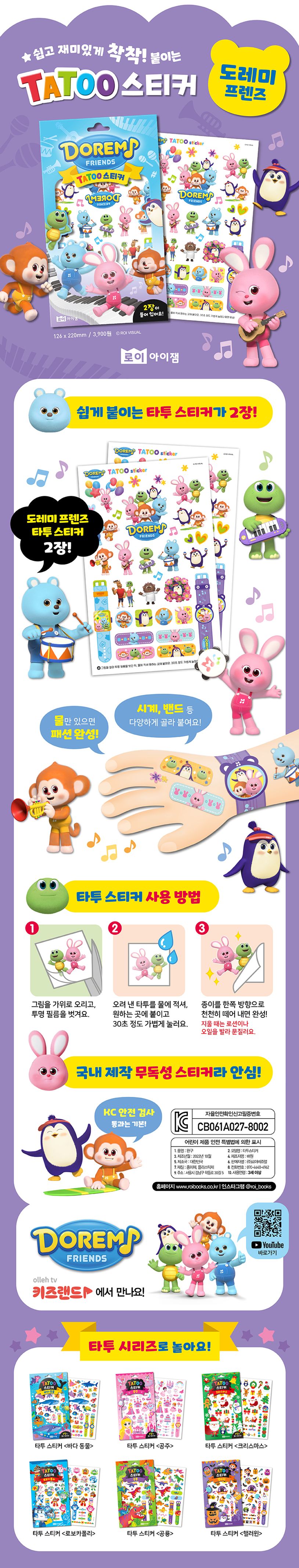 〈타투 스티커 - 도레미 프렌즈〉 편에는 멜로디 섬에 사는 귀여운 아기 동물 도도, 레미, 파, 솔, 라티의 다양한 모습을 담은 타투 스티커가 가득해요. 특히 아이들이 좋아하는 시계와 밴드 등 액세서리 모양의 타투도 들어 있어, 더욱 재미있게 골라 붙일 수 있답니다.