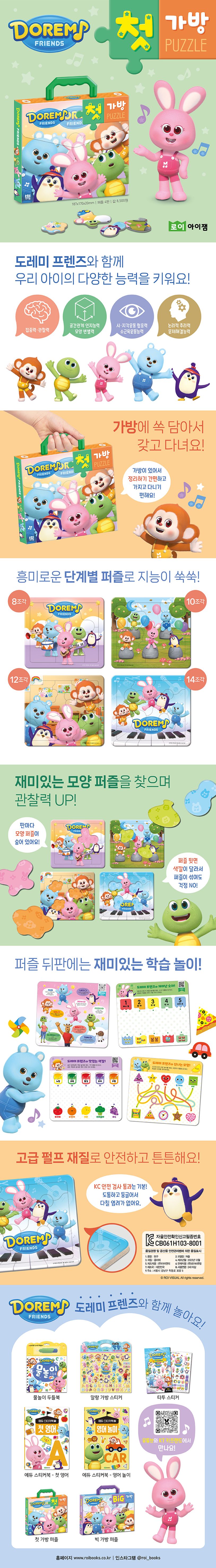 아이들 지능 발달에 좋은 퍼즐! 퍼즐이 좋다는 건 알지만, 낱낱이 흩어지는 퍼즐 조각 때문에 골치 아팠다면? 이제, 가방에 쏙 담아 들고 다니면서 우리 아이 두뇌를 깨워 주는 도레미 프렌즈 첫 가방 퍼즐을 만나 보세요!