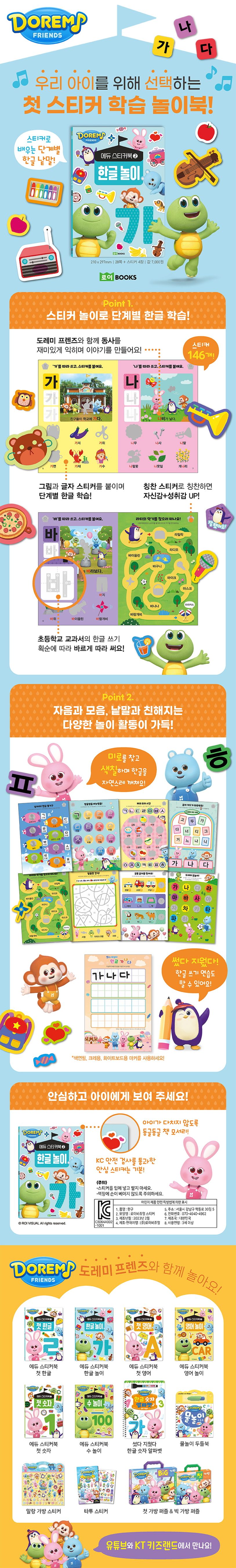 〈도레미 프렌즈 에듀 스티커북 시리즈〉는 아이들이 좋아하는 스티커 놀이와 한글, 영어, 수학을 결합한 학습 스티커북이에요. 도레미 프렌즈와 함께 스티커를 붙이며 신나게 놀다 보면 학습 내용을 쉽고 재미있게 배울 수 있어요. 또 스티커를 붙이는 동안 인지력과 표현력, 소근육 운동 능력까지 쑥쑥 발달된답니다!