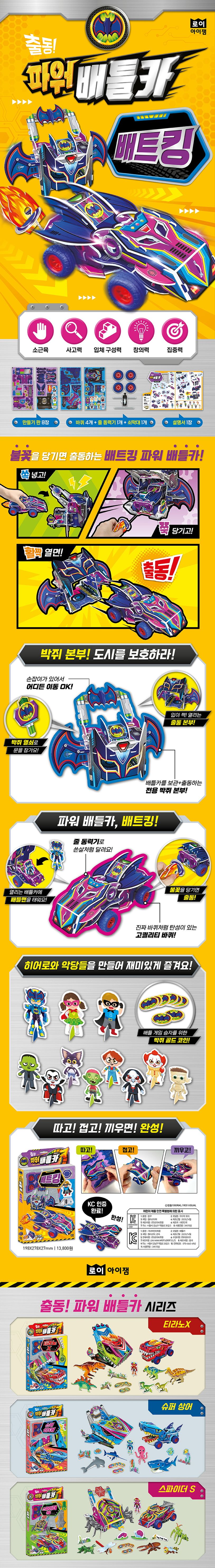 〈출동! 파워 배틀카-배트킹〉에는 박쥐의 왕을 연상시키는 “배트킹” 자동차와 배트킹을 보관하고 출동시키는 전용 “박쥐 본부”가 들어 있어요. 박쥐 본부에 배트킹을 쏙 집어넣고, 뒤쪽에 달린 불꽃을 쭉 당긴 뒤, 박쥐 본부의 손잡이를 살짝 누르면… 배틀킹이 쏜살처럼 출동해요! 뚜껑이 열리는 배트킹에는 배틀맨을 태울 수 있고, 박쥐 본부에는 손잡이가 달려 있어서 보관은 물론, 어디든 편하게 들고 다닐 수 있어요. 박쥐 열쇠로 박쥐 본부의 문을 잠그고 열 수도 있답니다!