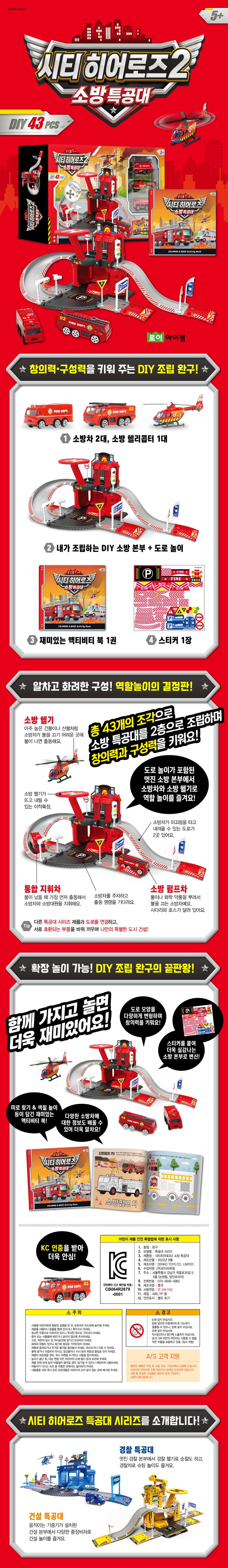 총 43개의 조립식 DIY 부품으로 커다란 2층 건물의 소방 본부를 조립하고, 회전 미끄럼 도로와 다양한 모양의 도로를 연결한 뒤 스티커를 붙여 더욱 실감나는 소방 본부를 만드세요. 그런 다음, 커다란 도로 놀이판에 소방 본부를 올려 두고, 3대의 특별한 탈것으로 역할 놀이를 해 보세요. 불이 나면 가장 먼저 출동하는 통합 지휘차와 사다리와 호스가 달린 소방 펌프차, 소방차가 갈 수 없는 곳에 출동해 불을 끄는 소방 헬리콥터 등 ‘소방 삼총사’를 가지고 노는 동안, 우리를 지켜주는 소방관 분들이 하는 일을 이해하고 감사한 마음을 갖게 될 거예요.