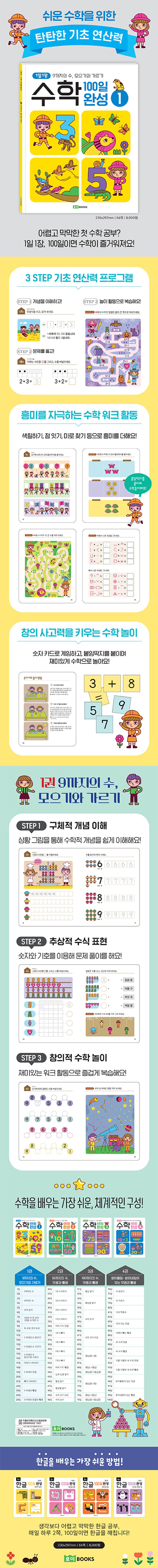 〈1일 1장 수학 100일 완성〉은 기초 연산력에 집중하는 프로그램입니다. 1일의 ‘5까지의 수’부터 100일의 ‘받아내림이 있는 뺄셈’까지 하루에 한 장씩 문제를 풀면서 수 감각을 키워 나갑니다. 구체적인 개념 설명과 추상적인 수식 풀이가 반복되는 구성은 아이가 원리를 모두 이해하고, 문제를 풀도록 돕습니다. 쉽게 문제를 풀고 점수가 잘 나오면 아이는 스스로 수학을 잘한다고 생각하게 되고, 수학에 대한 자신감이 높아지면 자연스럽게 수학 공부에 재미를 붙이게 됩니다.