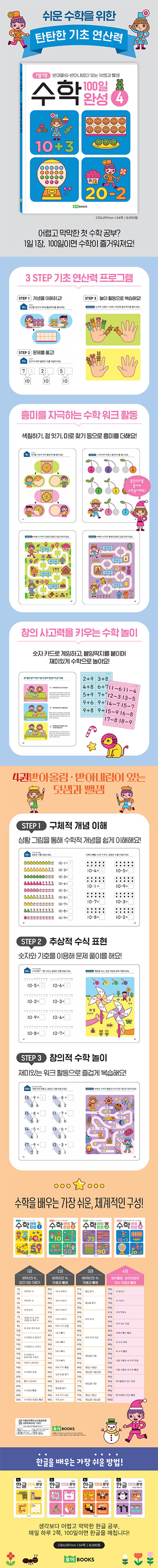 〈1일 1장 수학 100일 완성〉은 기초 연산력에 집중하는 프로그램입니다. 1일의 ‘5까지의 수’부터 100일의 ‘받아내림이 있는 뺄셈’까지 하루에 한 장씩 문제를 풀면서 수 감각을 키워 나갑니다. 구체적인 개념 설명과 추상적인 수식 풀이가 반복되는 구성은 아이가 원리를 모두 이해하고, 문제를 풀도록 돕습니다. 쉽게 문제를 풀고 점수가 잘 나오면 아이는 스스로 수학을 잘한다고 생각하게 되고, 수학에 대한 자신감이 높아지면 자연스럽게 수학 공부에 재미를 붙이게 됩니다.