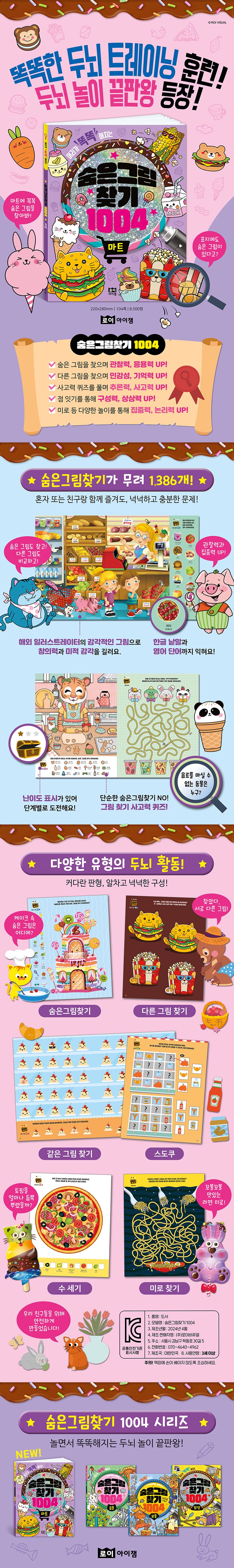 《숨은그림찾기 1004-마트》는 다채로운 두뇌 놀이 문제가 무려 1,386개나 들어 있어, 혼자 또는 친구나 가족과 함께 즐겨도 문제가 넉넉하고 충분해요! 단순한 숨은그림찾기로만 구성된 것이 아니라, 사고력과 추론력, 논리력을 키울 수 있는 “사고력 퀴즈”까지 들어 있어 더욱 똑똑한! 두뇌 훈련 트레이닝 북이랍니다. 돼지 저금통을 열어 동전의 개수를 세고, 스도쿠 규칙에 맞게 마트 식품을 진열할 뿐 아니라 귀여운 동물 친구들의 특별한 음료를 빨대 미로로 따라가면서 즐겁게 똑똑해질 수 있어요!
