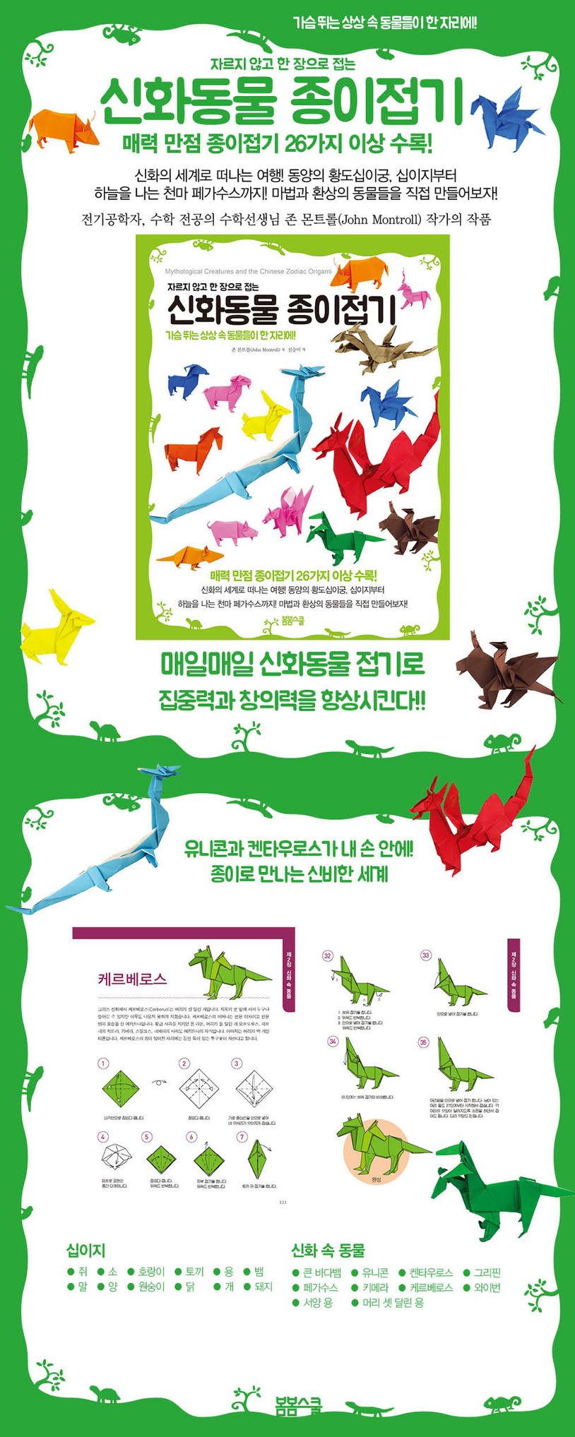 〈자르지 않고 한 장으로 접는 신화동물 종이접기〉는 동양의 황도 십이궁 이라고 할 수 있는 십이지와 서양의 고대신화에 등장하는 동물을 직접 접어볼 수 있는 책이다. 시중에 판매되고 있는 종이접기 도서들이 간단한 동식물이나 사물을 만드는 데 그쳤다면 이 책에서는 쥐, 소, 호랑이 등 시간과 방위를 수호하는 12간지 동물과 함께 유니콘, 켄타우로스, 와이번 등 26가지 이상의 신화 속 동물을 만들 수 있다.