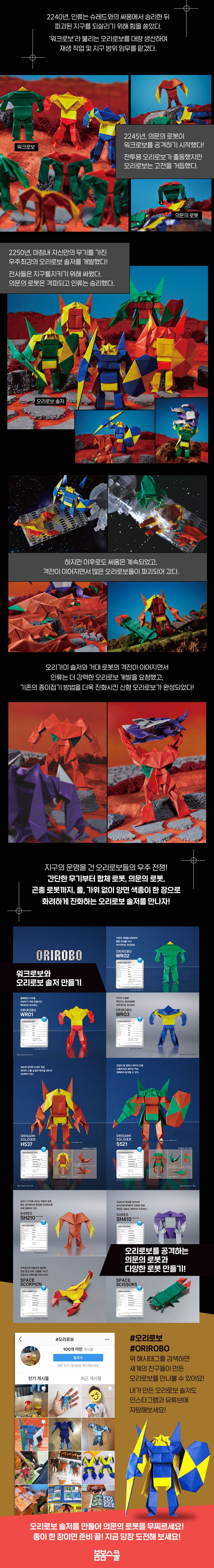 《오리로보》 시리즈로 전 세계 종이접기 팬들을 열광시킨 후지모토 무네지 작가가 더욱 확장된 세계관과 진화된 디자인의 《오리로보 오리가미 솔저》로 돌아왔습니다. 평화를 위협하는 새로운 적에 맞서기 위해 탄생한 다섯 가지 형태의 '오리가미 솔저'는 작가 특유의 정교함과 독창적인 메커니즘이 집약된 창작 로봇 종이접기의 결정체입니다.