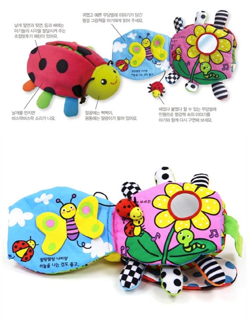 아기들이 좋아하는 동물 모양으로 되어 있어 즐거운 놀이 친구가 되어 주며, 부드러운 헝겊으로 말랑말랑하게 만들어 아기들에게 정서적인 안정감을 줍니다. 굵고 가는 선과 여러 가지 점무늬, 거울 등으로 아기들의 시각을 발달시켜주며, 딸랑딸랑 방울 소리와 삑삑이, 바스락거리는 다양한 소리를 통해 청각이 발달됩니다. 또, 우툴두툴하고 부드럽고 매끈한 느낌을 손끝으로 만날 수 있어 다양한 촉감을 발달시켜 줍니다. 열고, 집어 넣고, 당기고, 들춰 보는 등 다양한 활동을 할 수 있어 아기들의 소근육 발달에 도움이 됩니다.