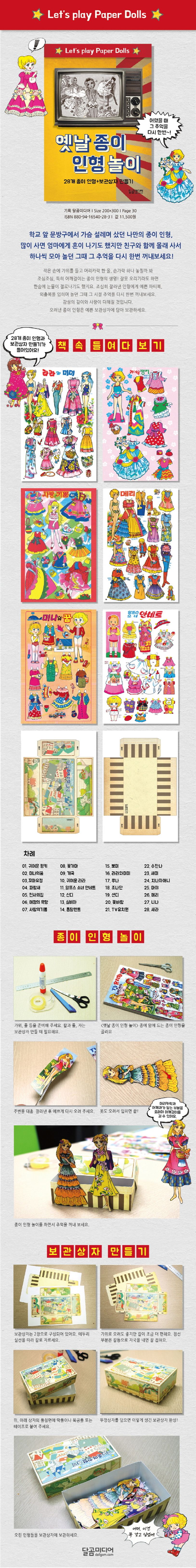 학교앞문방구에서가슴설레며샀던나만의종이인형,많이사면엄마에게혼이나기도했지만친구와함께몰래사서하나씩모아놀던짜릿함을선물,감성의보물상자를풍요롭게해주었죠.그종이인형그때그시절추억을다시한번꺼내보세요!책소개그때그시절추억속으로여행을떠나보세요!종이인형을예쁘게오려서옷입히기놀이등을재미있게할수있어요!70,80년대문방구의인기품목은남자아이들에게는딱지였다면여자아이들에게는당연히종이인형이었습니다.작은손에가위를들고머리카락한올,손가락하나놓칠까봐조심조심,특히어깨걸이는종이인형의생명.잘못오리기라도하면한숨에눈물이절로나기도했지요.조심히잘라낸인형에게예쁜파티복,외출복을입히며놀던그때그시절추억을다시한번꺼내보세요.감성의깊이와사랑이더해질것입니다.오려낸종이인형은예쁜보관상자에담아보관하세요.