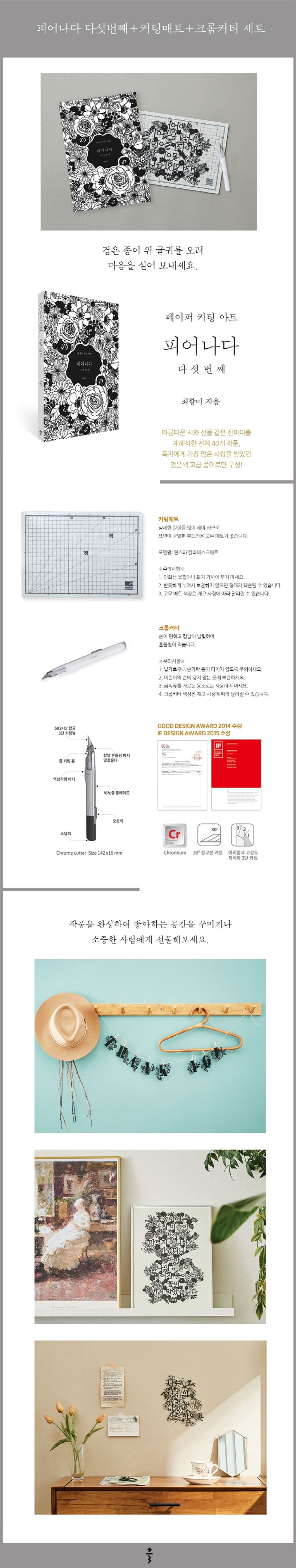 “피어나다 다섯번째 + 커팅매트 + 크롬커터 세트”는 페이퍼 커팅 아트를 즐길 때 꼭 필요한 두 가지 준비물을 함께 묶었다. 종이를 오려 작품을 완성하는 페이퍼 커팅 아트는 마음에 드는 그림과 고무 매트, 나이프, 마스킹 테이프만 있어도 충분하기 때문에 누구나 쉽게 접근할 수 있다. 좋아하는 음악을 들으며 자기만의 시간을 보내고 싶다면, 성취감이 느껴지는 남다른 취미를 찾고 있다면, 피어나다 다섯번째 + 커팅매트 + 크롬커터 세트와 함께 도전해보자.