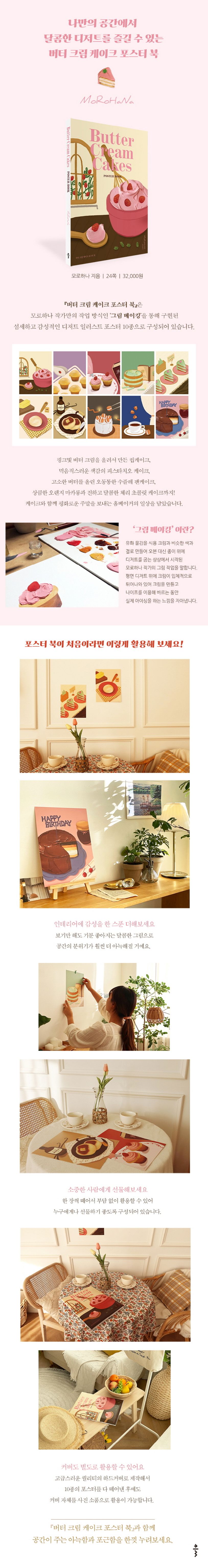 가장 좋아하는 맛의 케이크가 그려진 포스터를 골라 어울리는 공간에 붙여도 좋고, 달콤함을 나누고 싶은 사람에게 액자에 넣어 선물해도 좋습니다. 고급스러운 하드커버로 제작했기 때문에 포스터를 다 떼어내도 단단한 커버 그 자체로서 인테리어 소품으로 활용할 수도 있습니다. 마치 진짜 버터 크림을 잔뜩 얹어 풍부한 맛과 향을 담은 듯한 이 책으로 당신의 공간을 더욱 아늑하고 달콤하게 꾸며보세요.